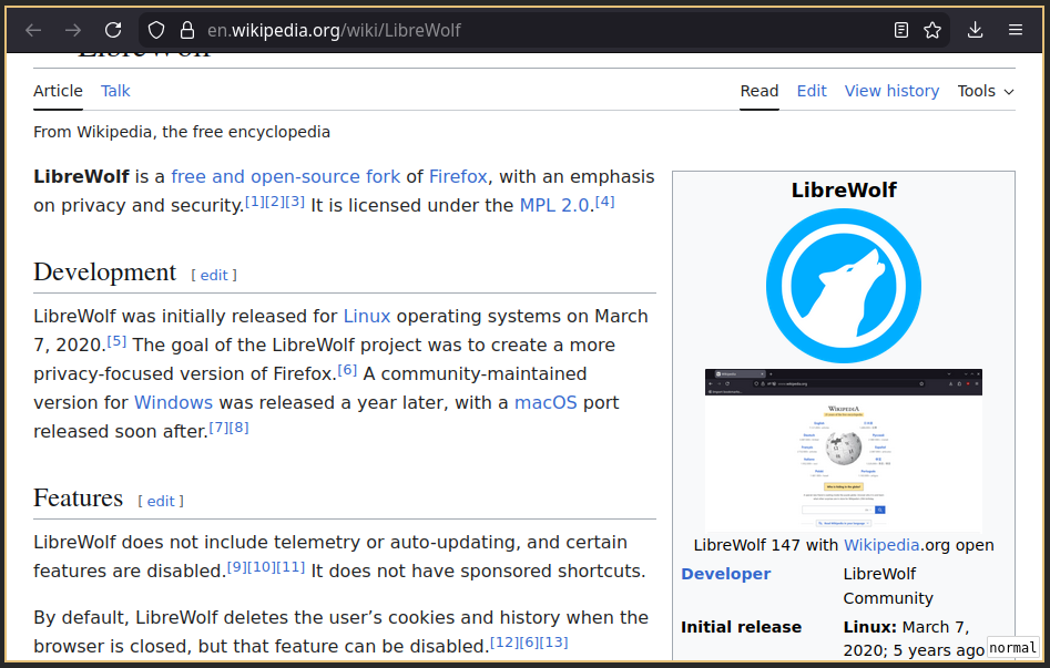 The web browser is one of the most important programs in my day-to-day work on the computer. I want a browser setup that addresses a couple of goals. First I’d like to be independent of large corporations that try to observe my browsing behaviour for their profit. That is why I’d rather use an open source implementation instead of the various chrome based browsers. Since the servo browser1 is not there yet2, a mozilla firefox based browser is the most viable option as of today. Because Mozilla has started to put more and more questionable features into the firefox main release line, I was looking to try one of the open source forks promising more privacy. I need a reasonable tradeoff between privacy and ease of use. That is why I didn’t went with the tor browser providing the best privacy of the alternatives I looked at. I settled with the LibreWolf browser.